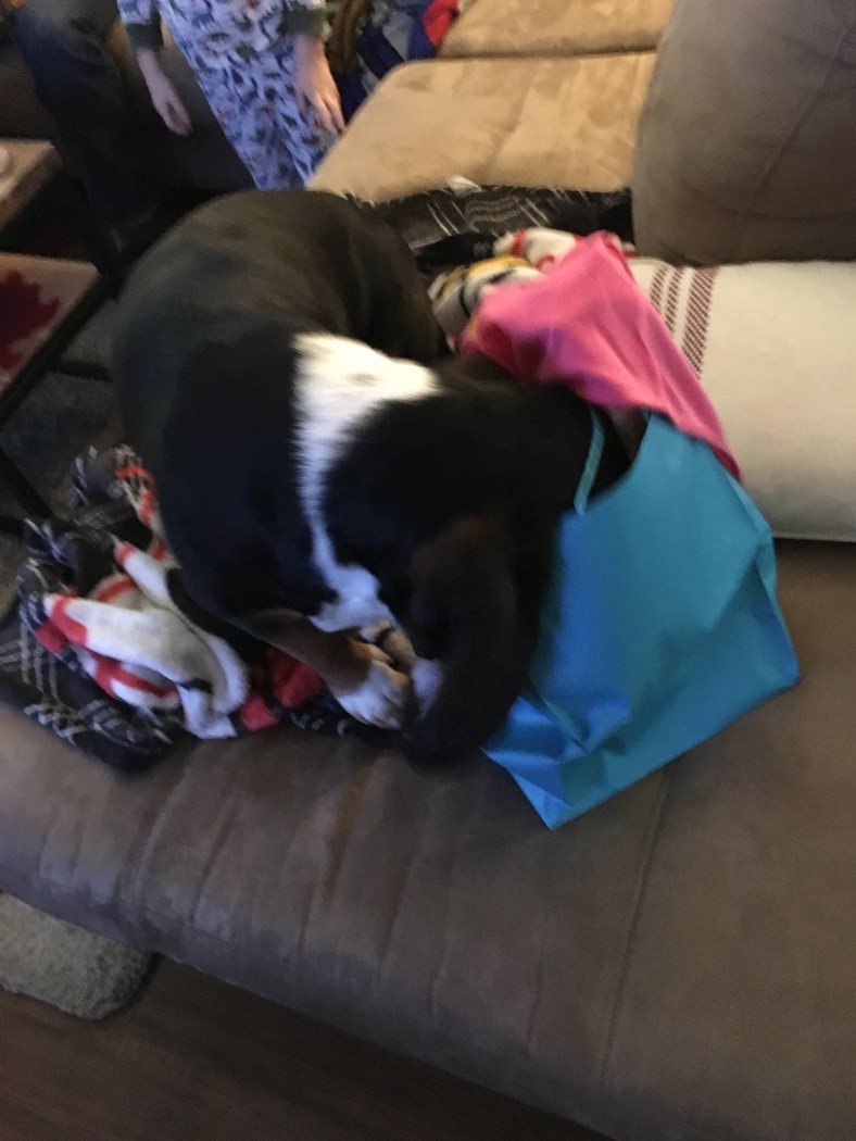 I got a bag full of goodies, treats and a new squeaky/crunchy toy I like to call Corny!! Mom presented me with the bag first thing in the morning!!