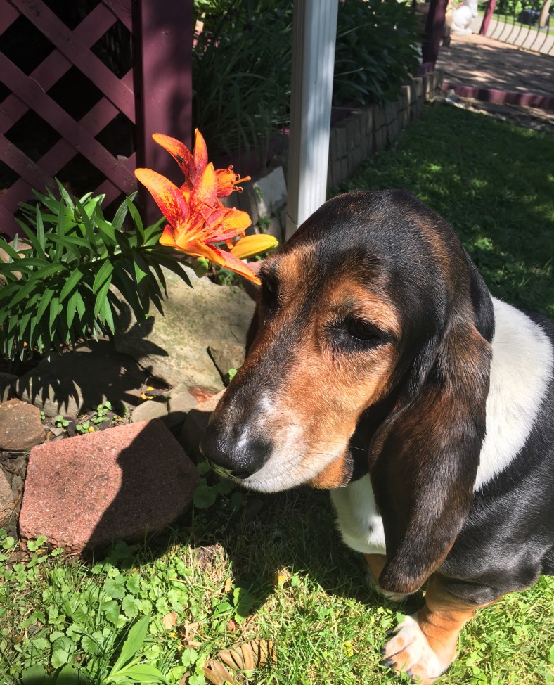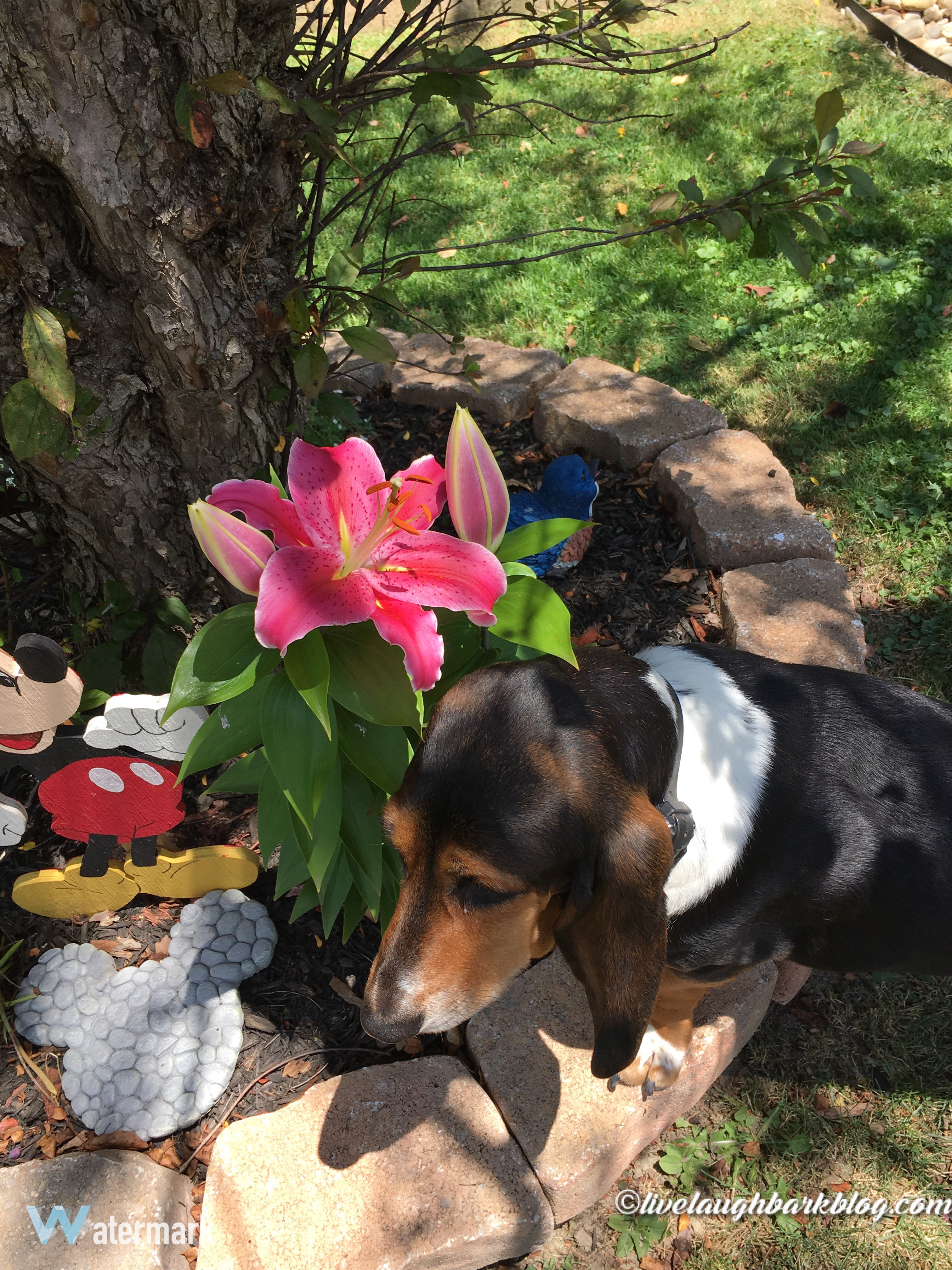 The weather here in the northeast has been unusually hot and muggy with temperatures reaching 80 by 10AM. Now while Miss Lilly is sort of ok with basking in the heat her sister does not share her enthusiasm. She spends most of the time inside right beside the air conditioner, outside in the shade or in her pool. While lying in the shade she does get a lovely view of some of our flowers around the house which have been blooming like crazy thanks to all the rain and heat.
