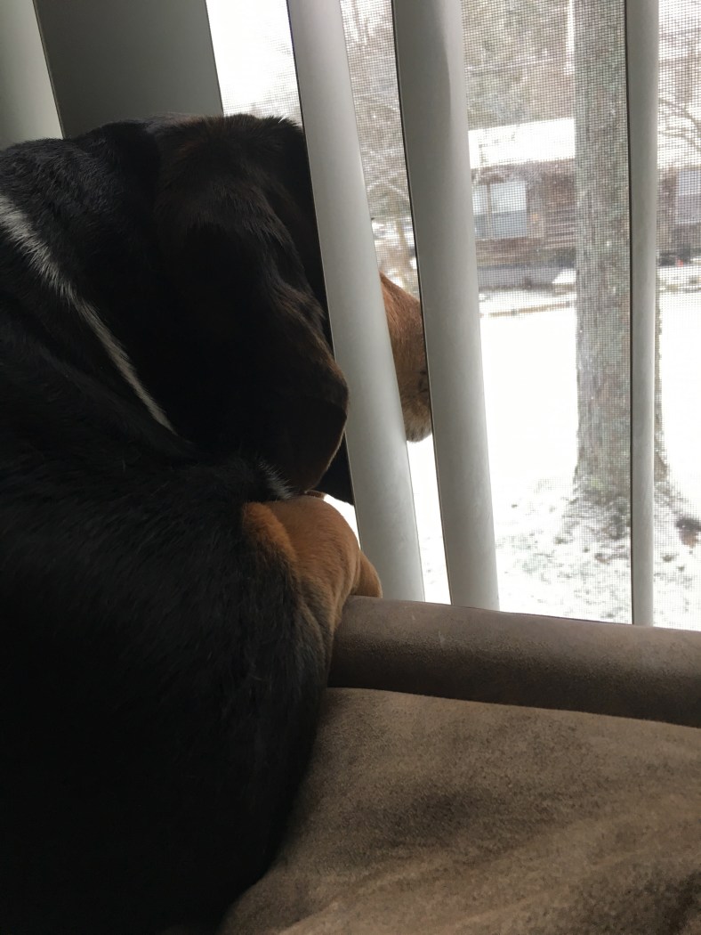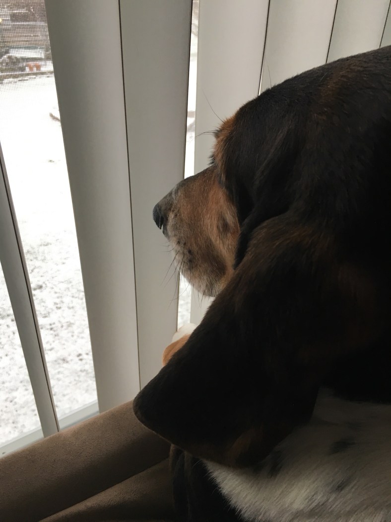 Someone is a little upset with the groundhog about his whole “early spring” prediction…19 this morning and a few more inches of snow…not ideal Basset weather!