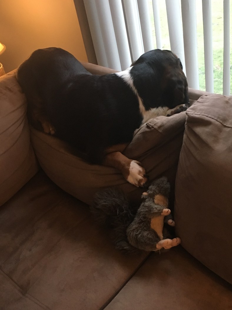 Of course with her superior hunting skills she was able to subdue it quickly and is pondering breakfast options while back at her post, careful not to let her prize out of paws reach.. (mom’s note: no real squirrels were harmed)